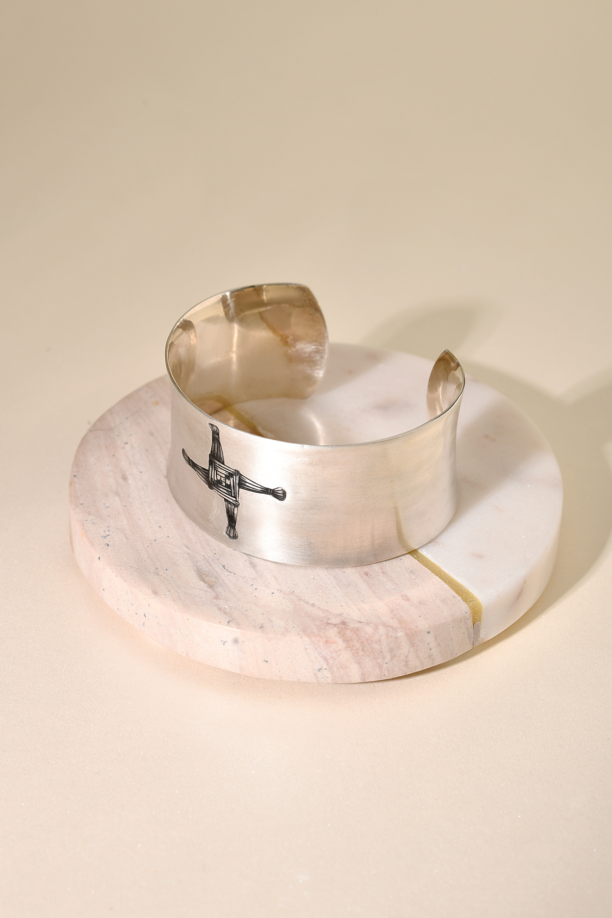 El yapımı “Brigid Cross” bileklik, %100 925 ayar gümüşten üretilmiş olup geniş formu ve mat yüzey dokusuyla güçlü, modern ve karakterli bir stil sunar. Üzerindeki Brigid Cross sembolü, detaylı işçiliği sayesinde dikkat çeker ve bileklikte mistik bir vurgu oluşturur.